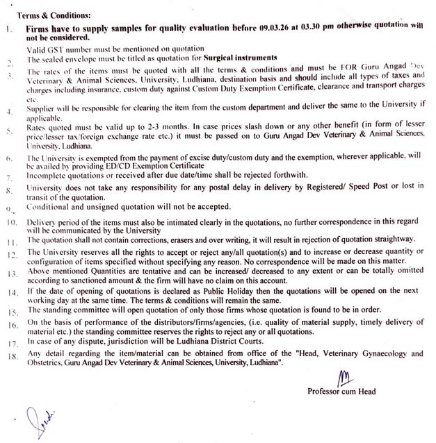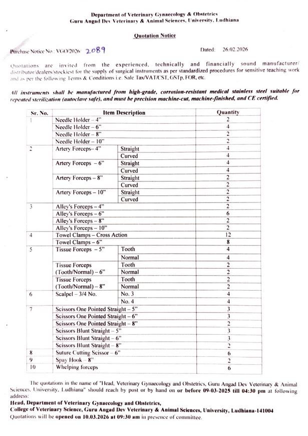 Quotation notice for surgical instruments, Head, Department of Veterinary Gynaecology & Obstetrics, Guru Angad Dev Veterinary & Animal Sciences University, Ludhiana
