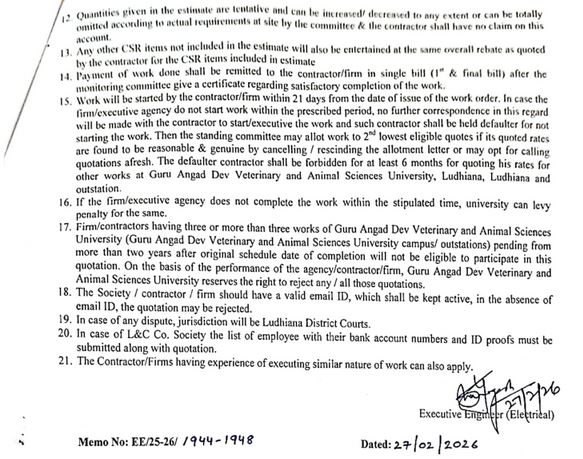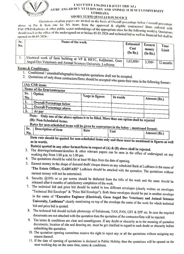 Short Term Quotation Notice for Electrical Work of Farm Building at VP & RRTC, Kaljharani, Executive Engineer (Electrical), GADVASU, Ludhiana