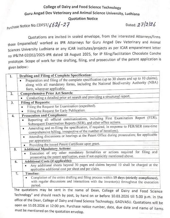 Quotation notice for Patent/Ip filing of chocolate conche, Dean, College of Dairy & Food Science Technology, Guru Angad Dev Veterinary & Animal Sciences University, Ludhiana
