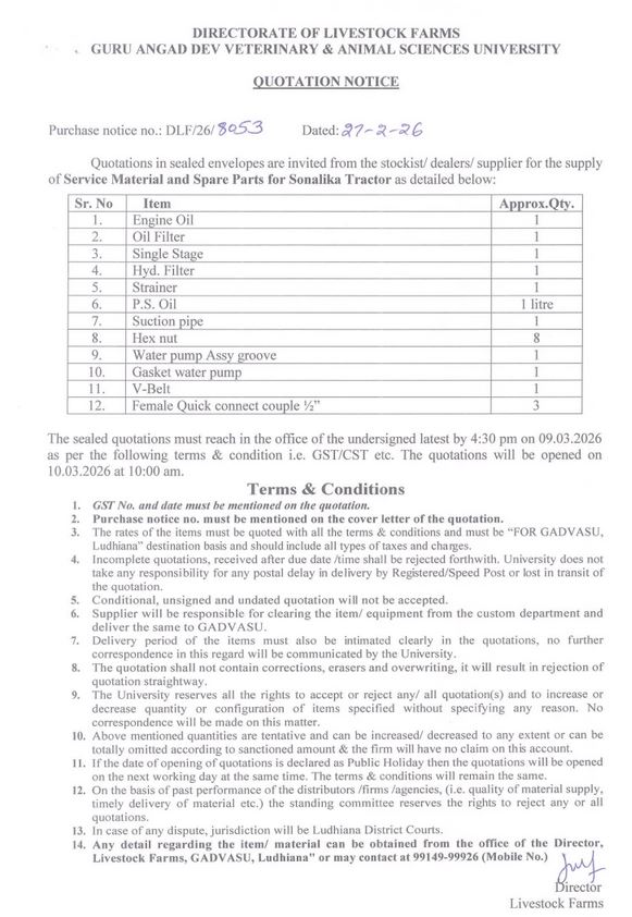 Quotation Notice for the supply of Service Material and Spare Parts for Sonalika Tractor, Director, Livestock Farms, Guru Angad Dev Veterinary and Animal Sciences University, Ludhiana