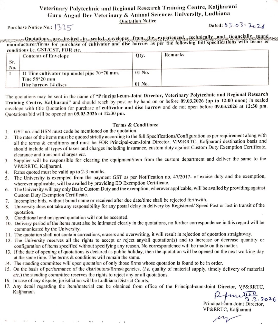 Quotation notice for purchase of cultivator & Disc Harrow, Principal-cum-Joint Director, Veterinary Polytechnic and Regional Research Training Centre, Kaljharani, GADVASU, Ludhiana
