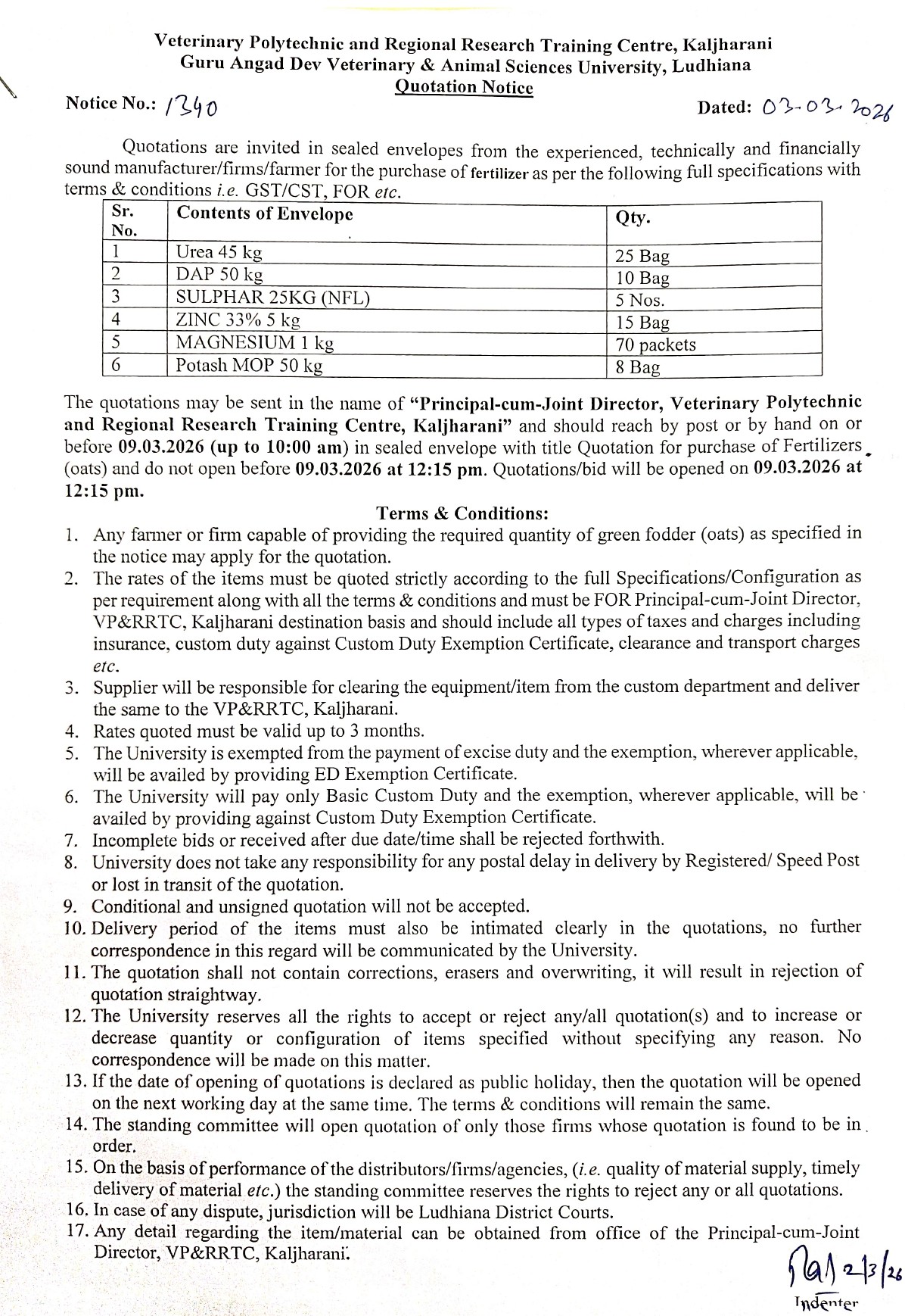 Quotation notice for purchase of Fertilizer, Principal-cum-Joint Director, Veterinary Polytechnic and Regional Research Training Centre, Kaljharani, GADVASU, Ludhiana