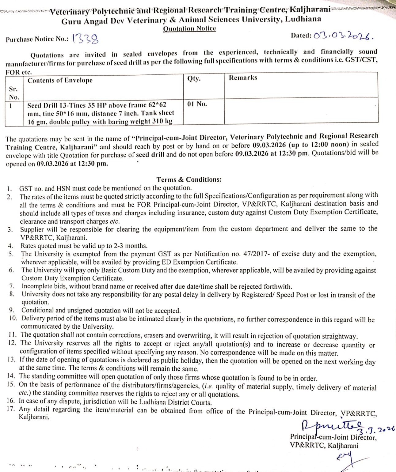 Quotation notice for purchase of Seed Drill, Principal-cum-Joint Director, Veterinary Polytechnic and Regional Research Training Centre, Kaljharani, GADVASU, Ludhiana