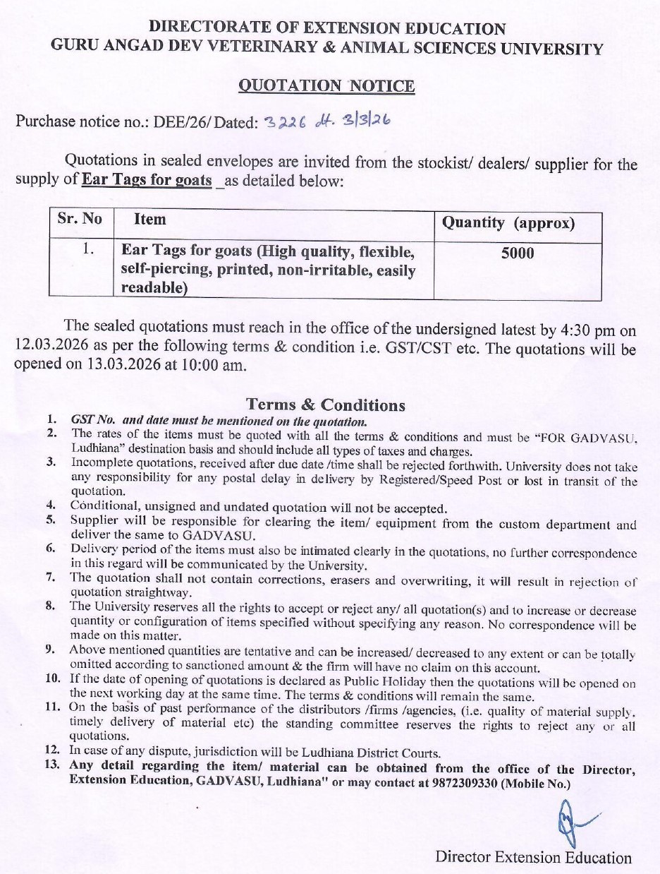 Quotation notice for the supply of Ear Tags for Goats, Director Extension Education, Guru Angad Dev Veterinary and Animal Sciences, University, Ludhiana