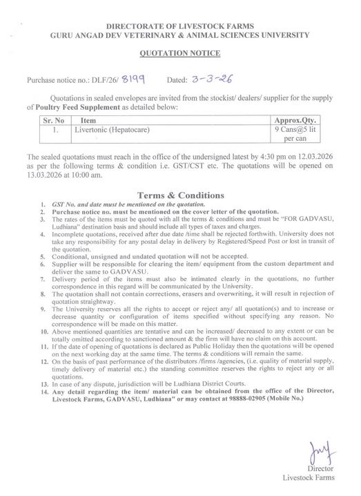 Quotation Notice for the supply of Poultry Feed Supplement, Director, Livestock Farms, Guru Angad Dev Veterinary and Animal Sciences University, Ludhiana