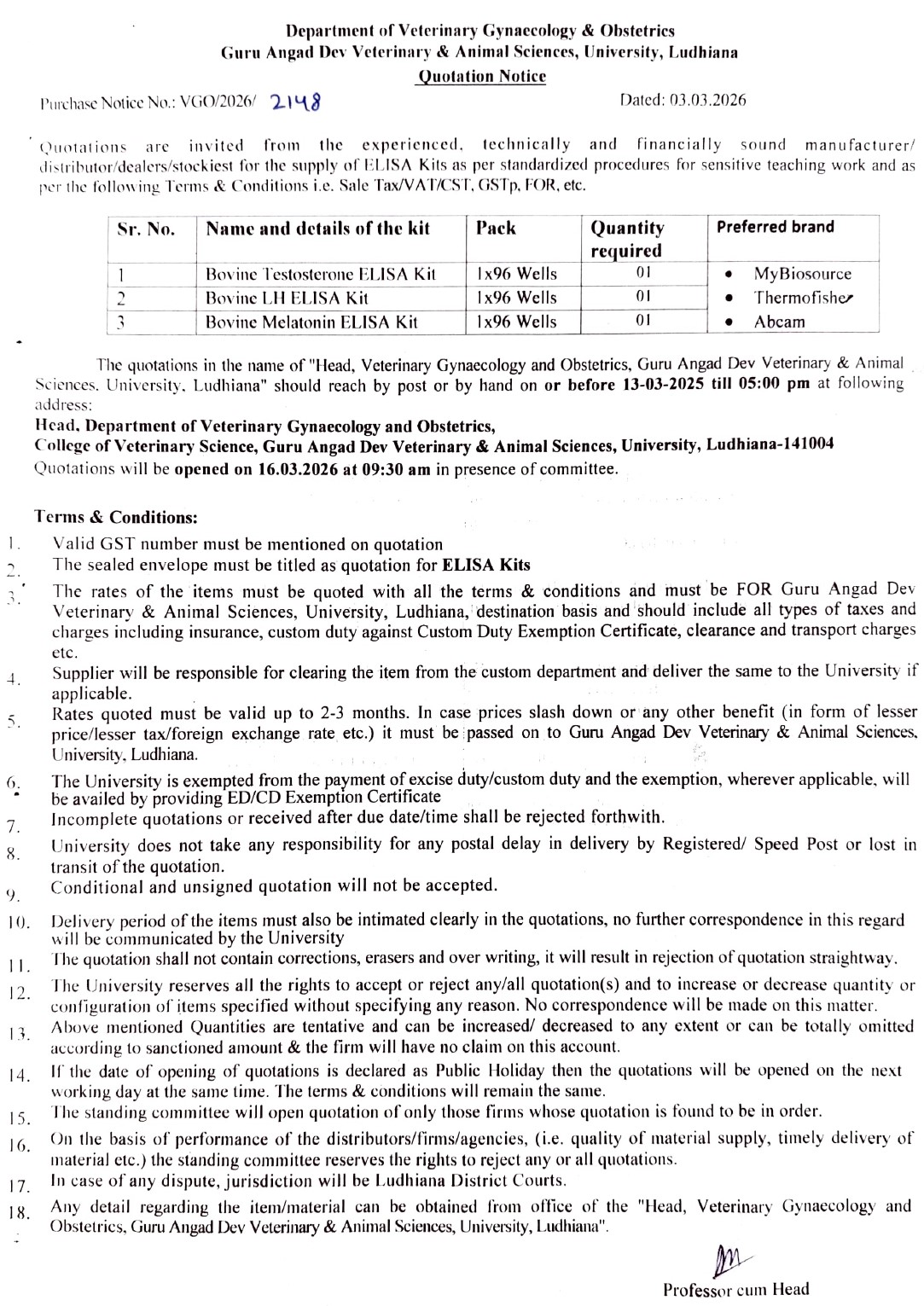 Quotation notice for purchase of ELISA Kits, Professor cum Head, Department of Veterinary Gynaecology & Obstetrics, Guru Angad Dev Veterinary & Animal Sciences University, Ludhiana
