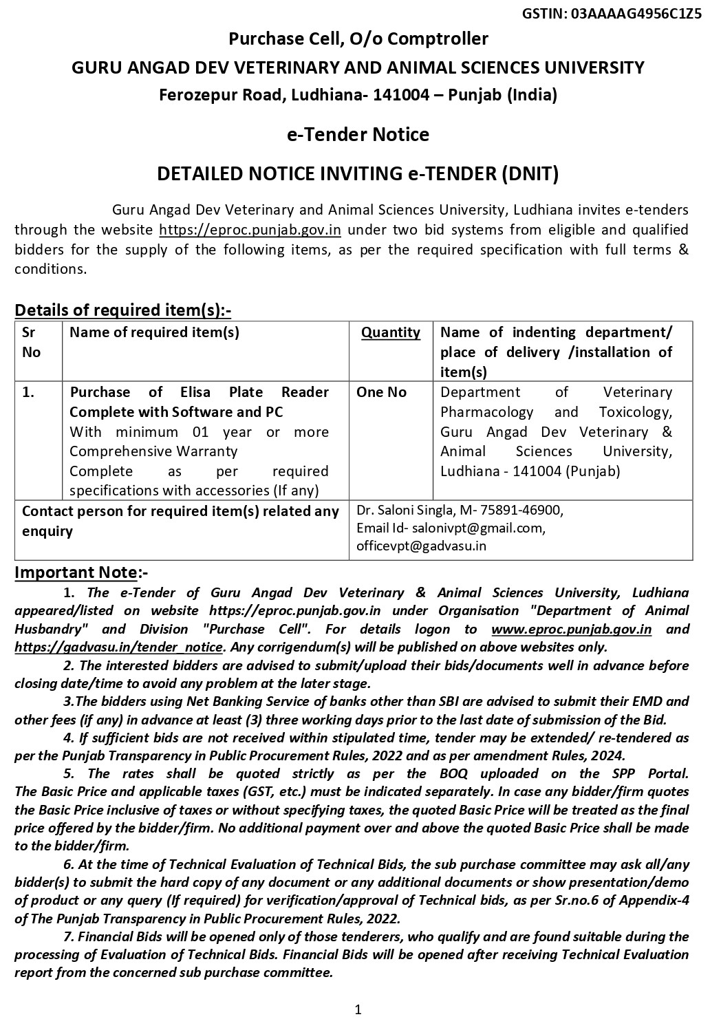 e -Tender notice for the purchase of Elisa Plate Reader Complete with Software and PC, Assistant Store Officer, Purchase Cell, Comptroller, GADVASU, Ldh