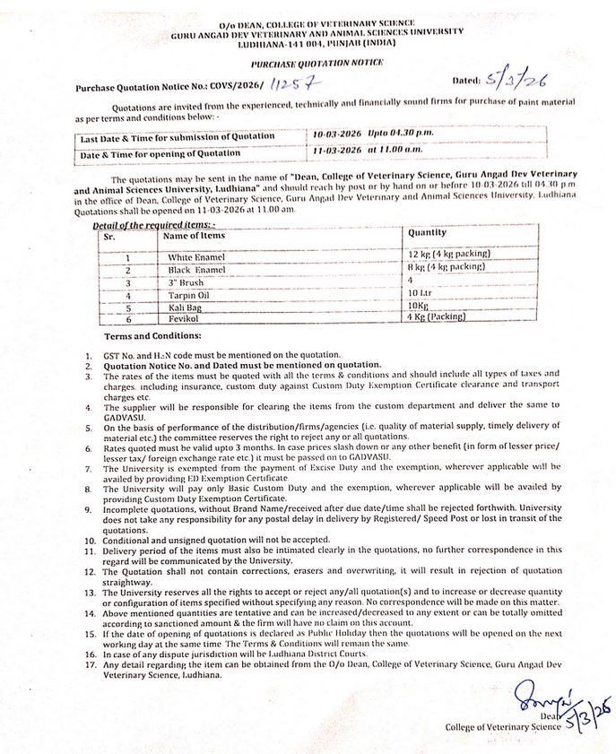 Quotation notice for the purchase of Paint Material, Dean, College of Veterinary Science, Guru Angad Dev Veterinary & Animal Sciences University, Ludhiana