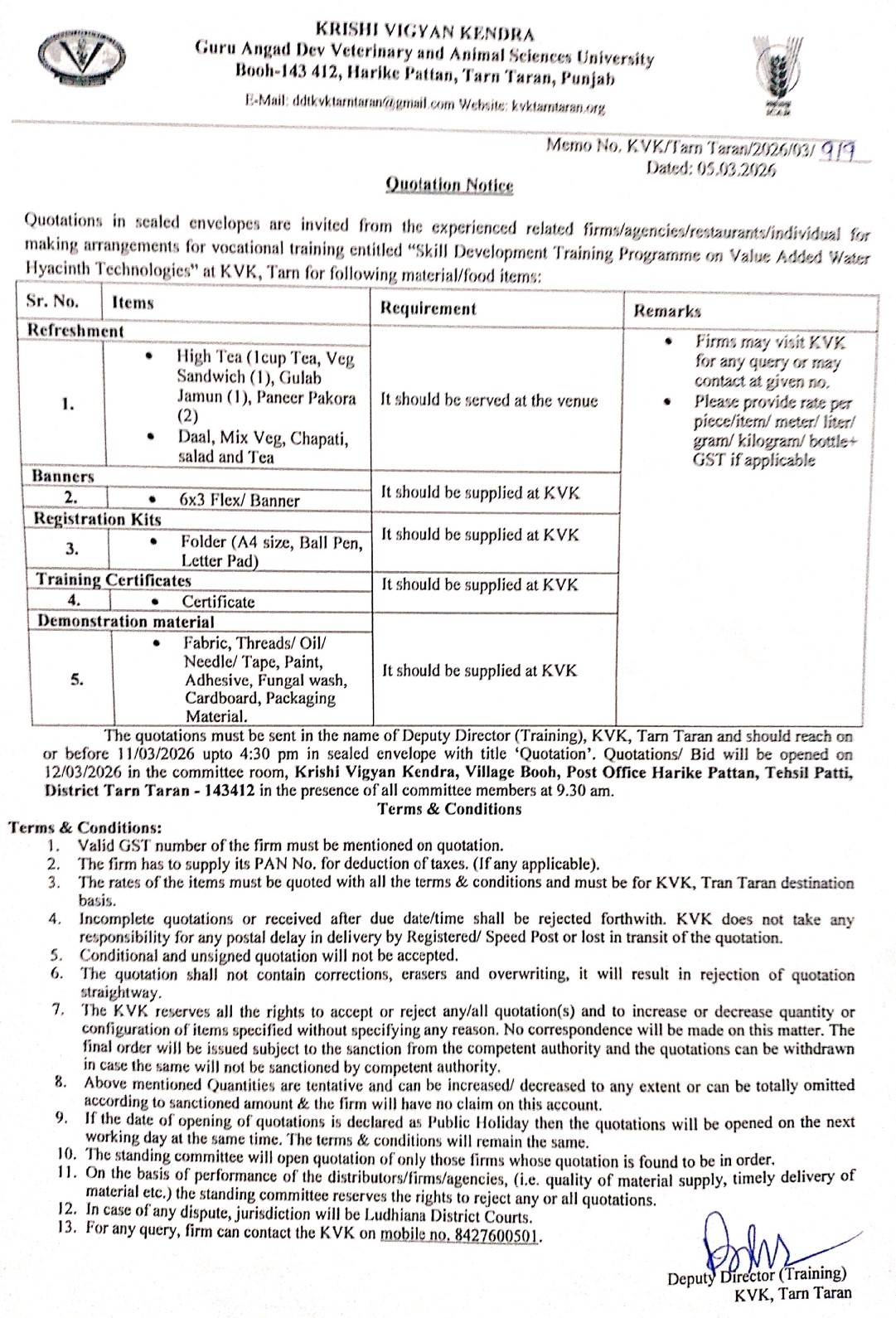 Quotation Notice for Refreshment/Banner/Registration kits/Demonstration materials/Certificate etc. for conducing skill development training programme, Krishi Vigyan Kendra, GADVASU, Taran Tarn