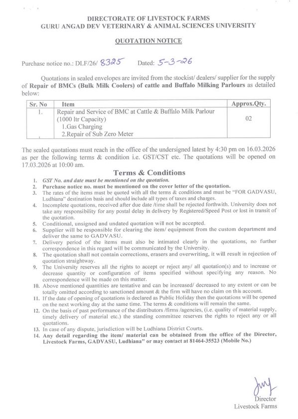 Quotation Notice for Repair of BMCs of Cattle & Buffalo Milking Parlour, Director, Livestock Farms, Guru Angad Dev Veterinary and Animal Sciences University, Ludhiana