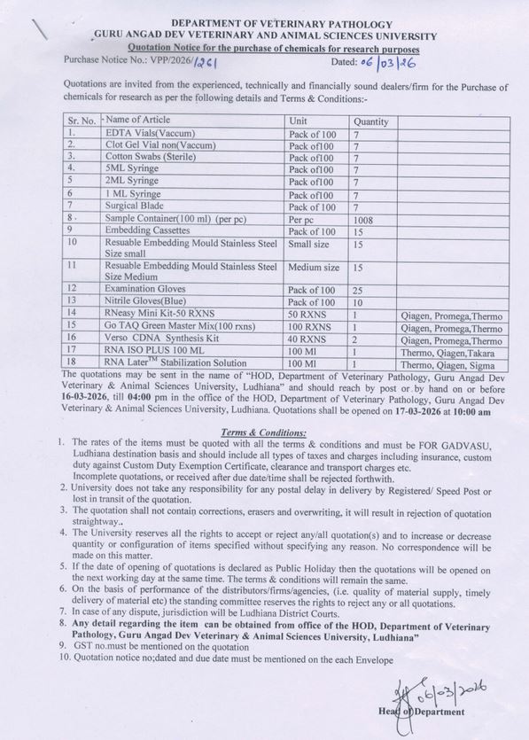 Quotation Notice for the purchase of Chemicals for Research, Department of Veterinary Pathology, COVS, Guru Angad Dev Veterinary & Animal Sciences University, Ludhiana