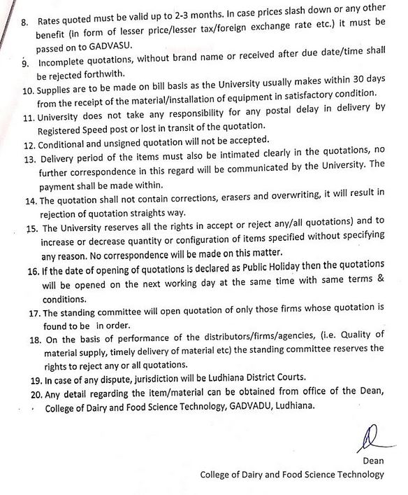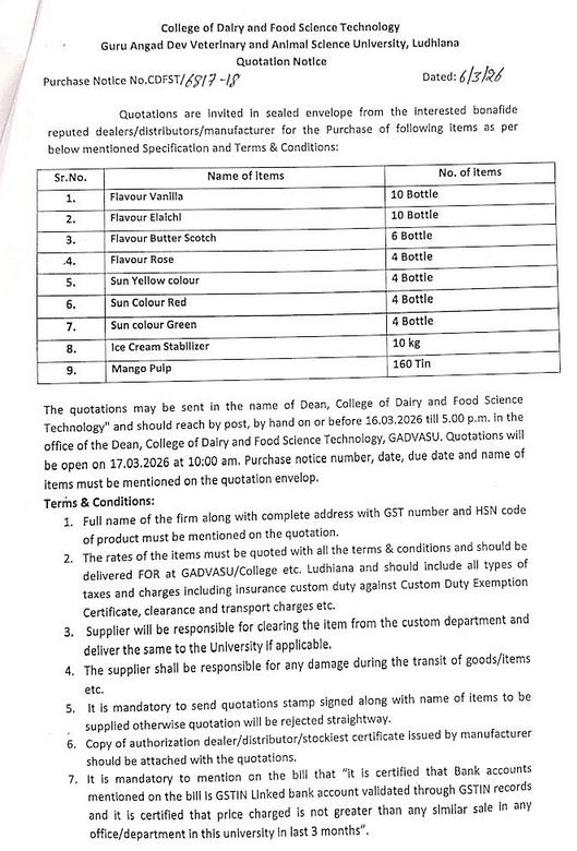 Quotation notice for the purchase of Various Flavours (Vanilla, Elaichi, Butter Scotch, Rose, Yellow Colour, Green Colour etc.), Dean, College of Dairy & Food Science Technology, GADVASU, Ludhiana
