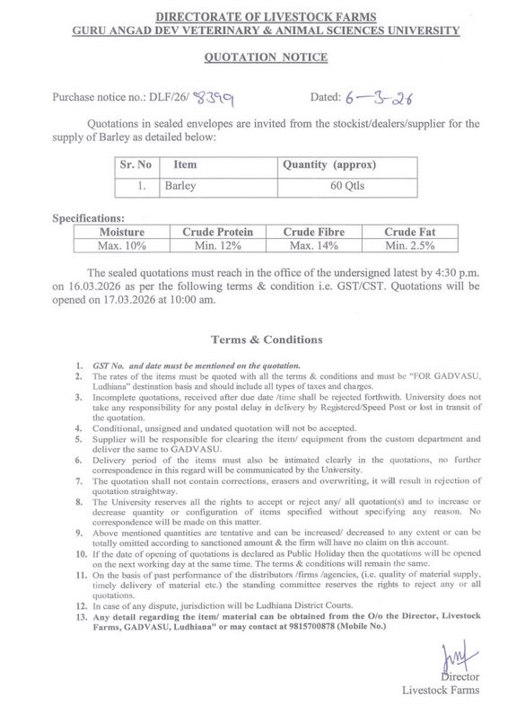 Quotation Notice for the supply of Barley, Director, Livestock Farms, Guru Angad Dev Veterinary and Animal Sciences University, Ludhiana