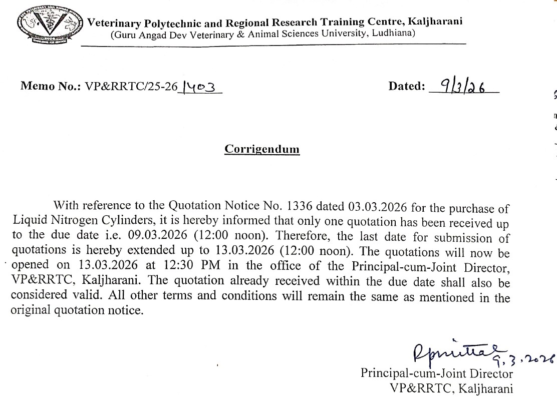 Corrigendum Quotation notice no 1336 dated 3.3.2026 for the purchase of Liquid Nitrogen Cylinders, Principal-cum-Joint Director, Vety Polytechnic & Regional Research Training Centre, Kaljharani