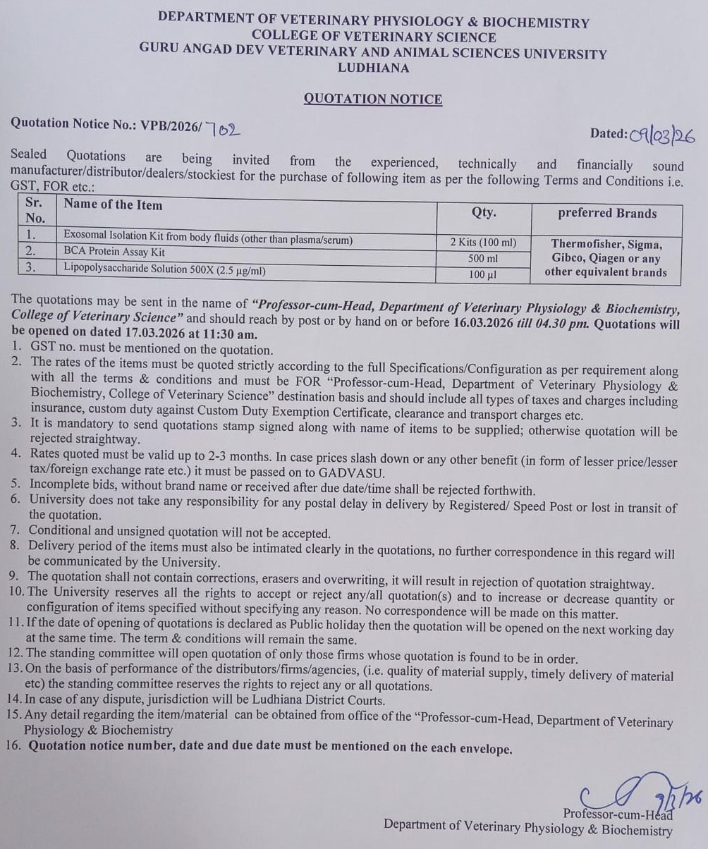 Quotation notice for the purchase of Exosomal Isolation Kits, Professor cum Head, Department of Veterinary Physiology & Biochemistry, COVS, GADVASU, Ludhiana