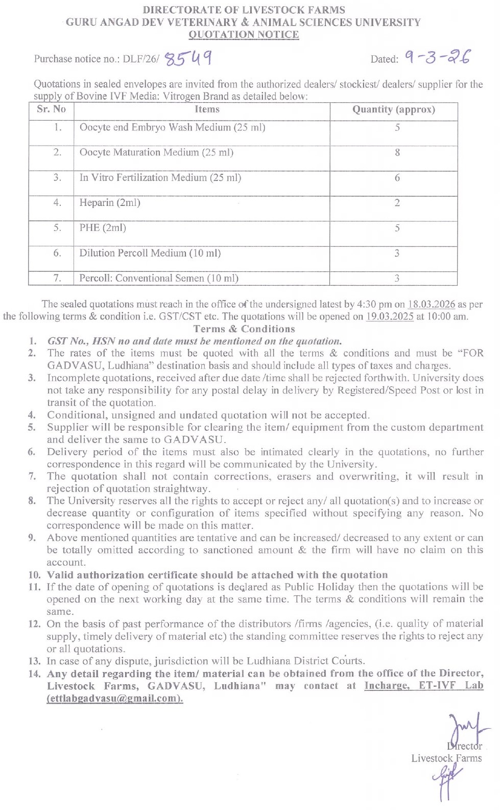 Quotation Notice for the supply of Bovine IVF Media: Vitrogen Brand, Director, Livestock Farms, Guru Angad Dev Veterinary and Animal Sciences University, Ludhiana