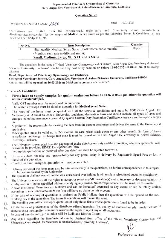 Quotation notice for High quality Medical Scrub Suite, Head, Department of Veterinary Gynaecology & Obstetrics, GADVASU, Ludhiana
