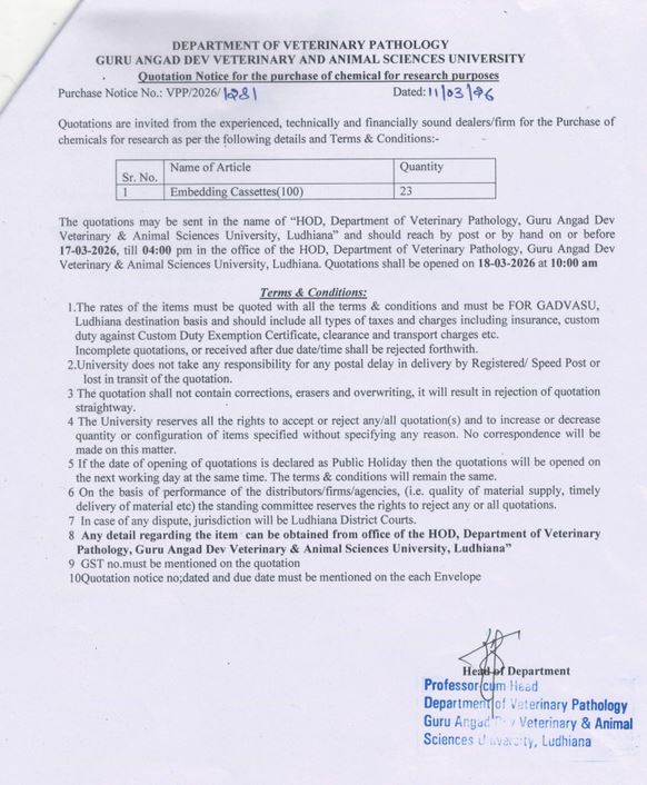 Quotation Notice for the purchase of Chemical for Research, Department of Veterinary Pathology, COVS, Guru Angad Dev Veterinary & Animal Sciences University, Ludhiana