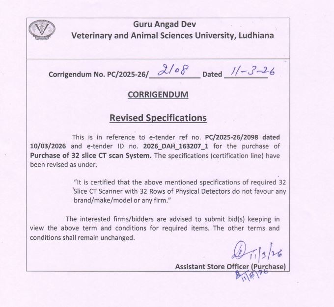 CORRIGENDUM for Revised Specifications for the Purchase of 32 slice CT scan System along with 5 year warranty, Assistant Store Officer, Purchase Cell O/o Comptroller, GADVASU, Ludhiana