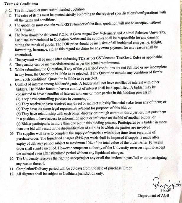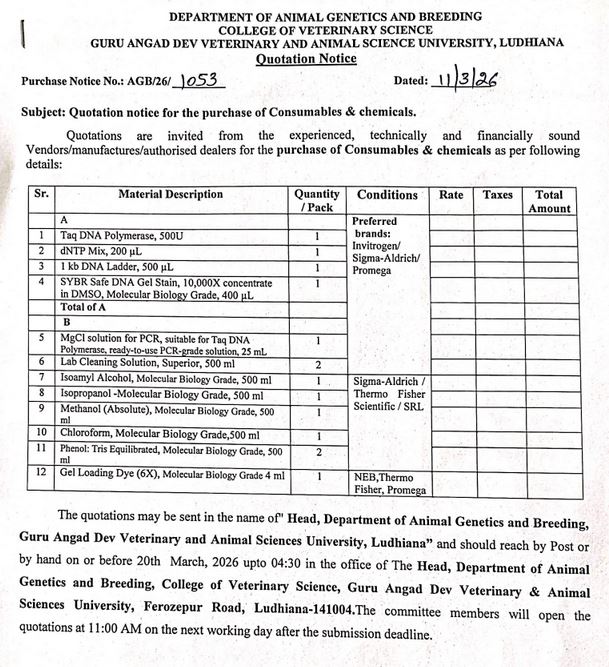 Quotation notice for the purchase of Consumables & Chemicals, Head, Department of Animal Genetics and Breeding, GADVASU, Ludhiana