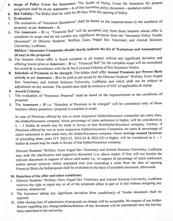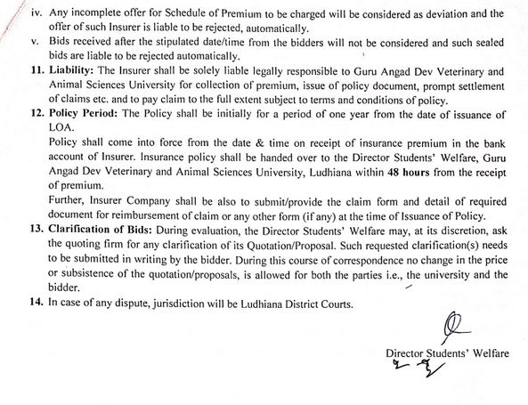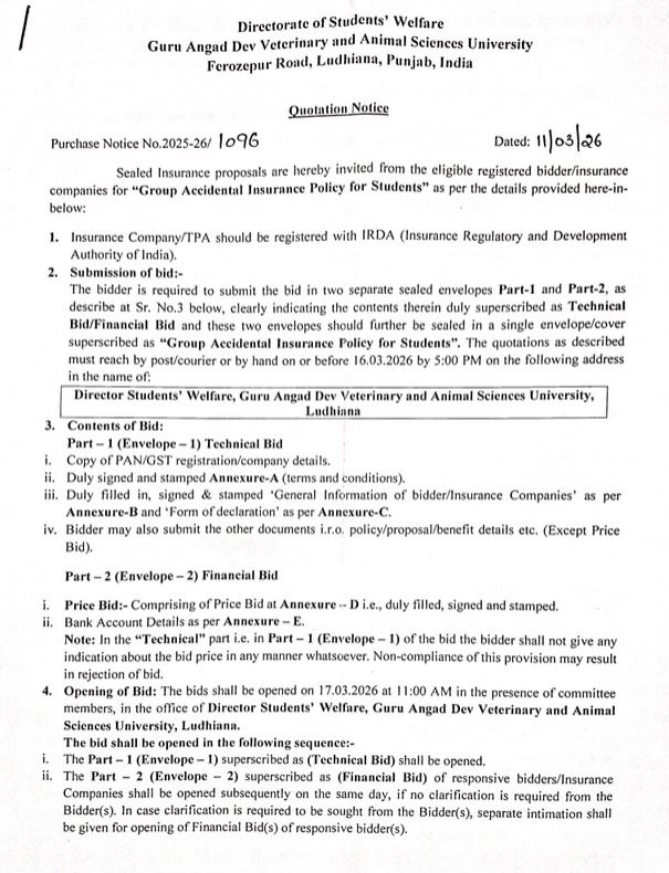 Quotation notice for Group Accidental Insurance Policy for Students, Director Students Welfare, Guru Angad Dev Veterinary and Animal Sciences University, Ludhiana