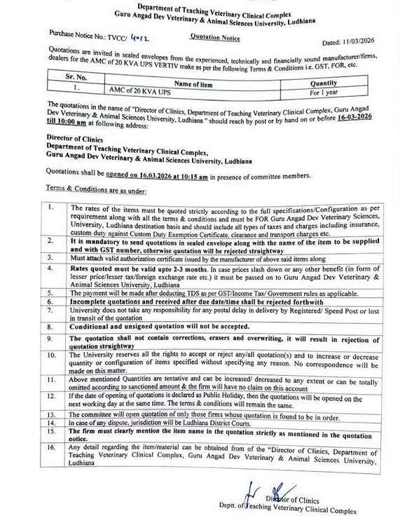 Quotation Notice for the AMC of 20 KVA UPS, Director of Clinics, Department of Teaching Veterinary Clinical Complex, Guru Angad Dev Veterinary & Animal Sciences University, Ludhiana