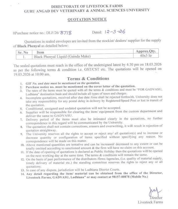 Quotation Notice for the supply of Black Phenyal, Director, Livestock Farms, Guru Angad Dev Veterinary and Animal Sciences University, Ludhiana