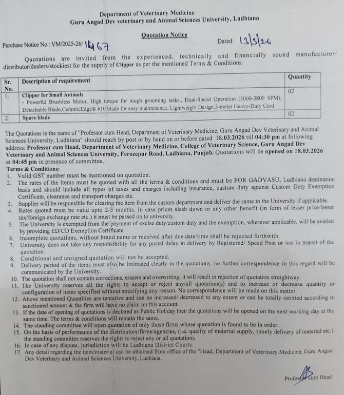 Quotation notice for supply of Clipper for Small Animals, Professor cum Head, Department of Veterinary Medicine, Guru Angad Dev Veterinary & Animal Sciences University, Ldh