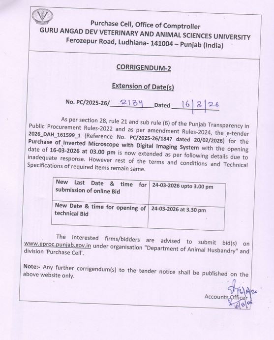 Corrigendum 2 for Extension of dates of e tender for the purchase of Inverted Microscope with Digital Imaging System, Accounts Officer, Purchase Cell O/o Comptroller, GADVASU, Ludhiana