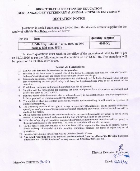 Quotation notice for the supply of Alfalfa Hay Bales, Director Extension Education, Guru Angad Dev Veterinary and Animal Sciences, University, Ludhiana