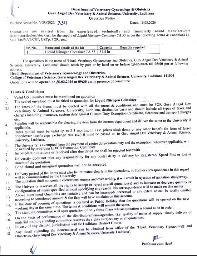 Quotation notice for supply of Liquid Nitrogen Container TA 55, Head, Department of Veterinary Gynaecology & Obstetrics, GADVASU, Ludhiana
