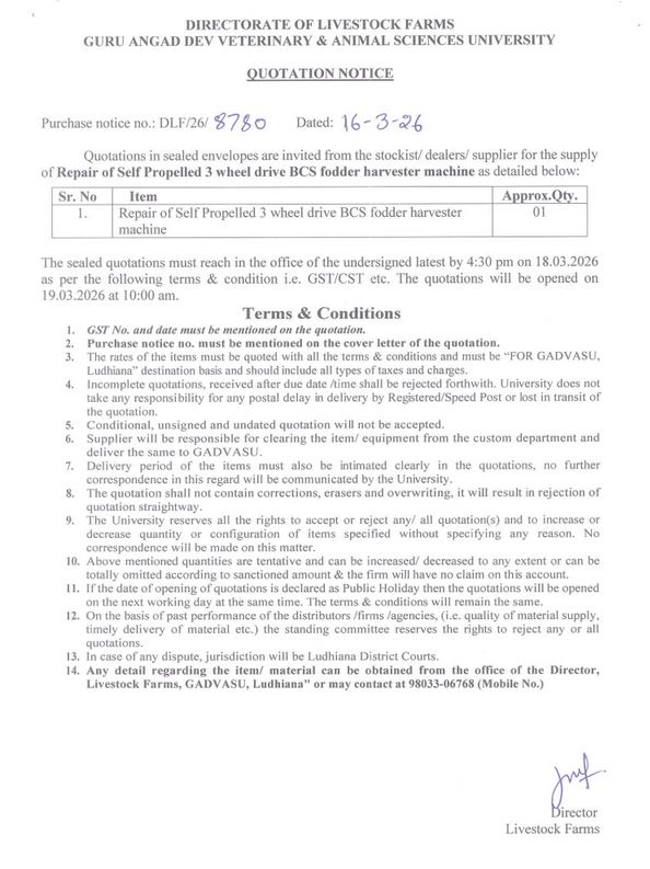 Quotation Notice for Repair of Self Propelled 3 wheel drive BCS fodder harvester machine, Director, Livestock Farms, Guru Angad Dev Veterinary and Animal Sciences University, Ludhiana