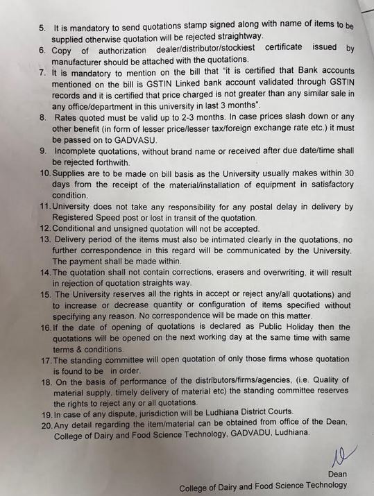 Quotation Notice for the purchase of Consumable Items, Dean, College of Dairy & Food Science Technology, Guru Angad Dev Veterinary & Animal Sciences University, Ludhiana