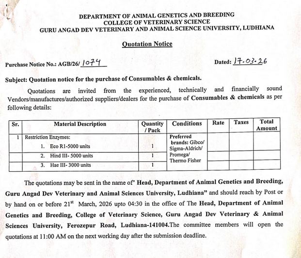 Quotation notice for the purchase of Consumables & Chemicals, Department of Animal Genetics and Breeding, GADVASU, Ludhiana