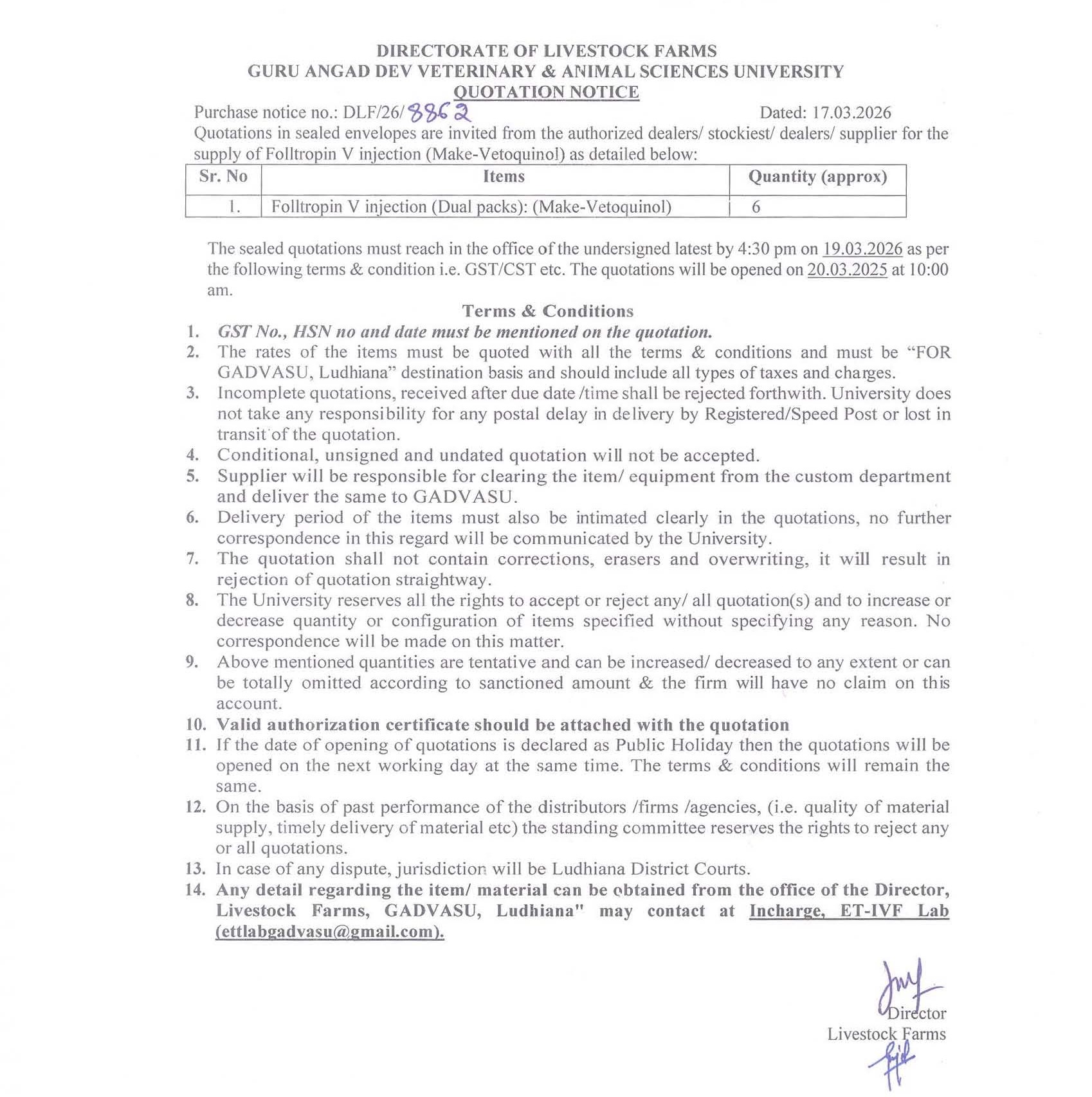 Quotation Notice for the supply of Folltropin V injection, Director, Livestock Farms, Guru Angad Dev Veterinary and Animal Sciences University, Ludhiana