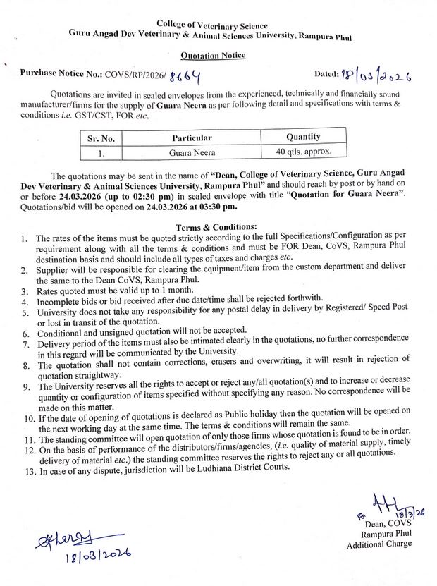 Quotation notice for the supply of Guara Neera, Dean, College of Veterinary Science, Guru Angad Dev Veterinary & Animal Sciences University, Rampura Phul