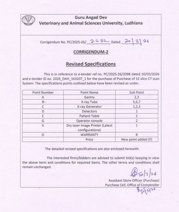 CORRIGENDUM- 2 for Revised Specifications for the Purchase of 32 slice CT scan System along with 5 year warranty, Assistant Store Officer, Purchase Cell O/o Comptroller, GADVASU, Ludhiana