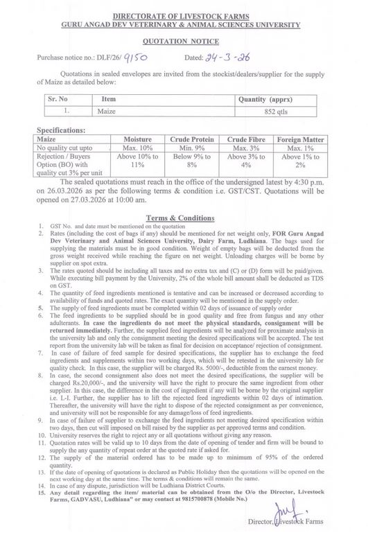 Quotation notice for the supply of Maize, Director, Livestock Farms, Guru Angad Dev Veterinary and Animal Sciences University, Ludhiana
