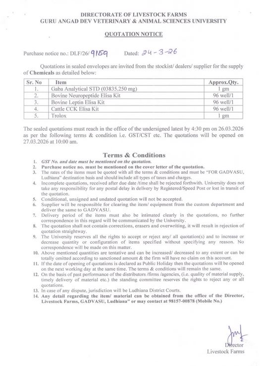 Quotation notice for the supply of Chemicals, Director, Livestock Farms, Guru Angad Dev Veterinary and Animal Sciences University, Ludhiana