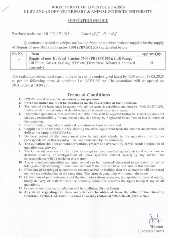 Quotation Notice for the Repair of New Holland Tractor, Director, Livestock Farms, Guru Angad Dev Veterinary and Animal Sciences University, Ludhiana