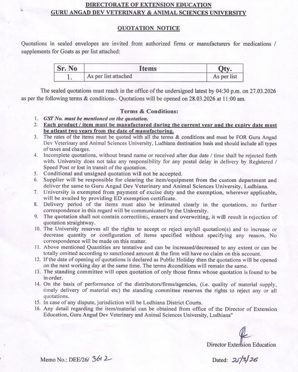 Quotation notice for the supply of Medications/Supplements for Goats, Director Extension Education, Guru Angad Dev Veterinary and Animal Sciences, University, Ludhiana