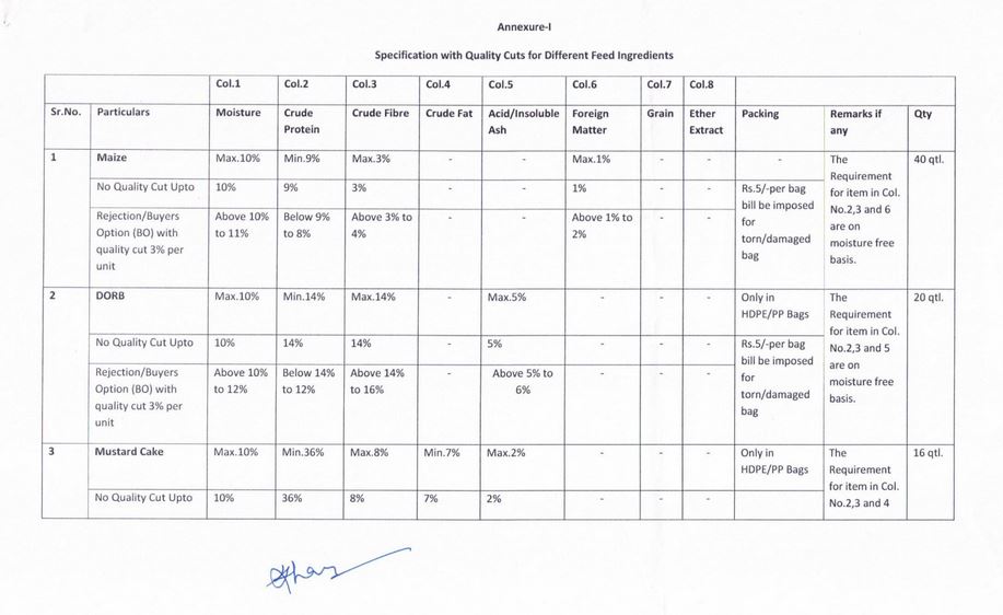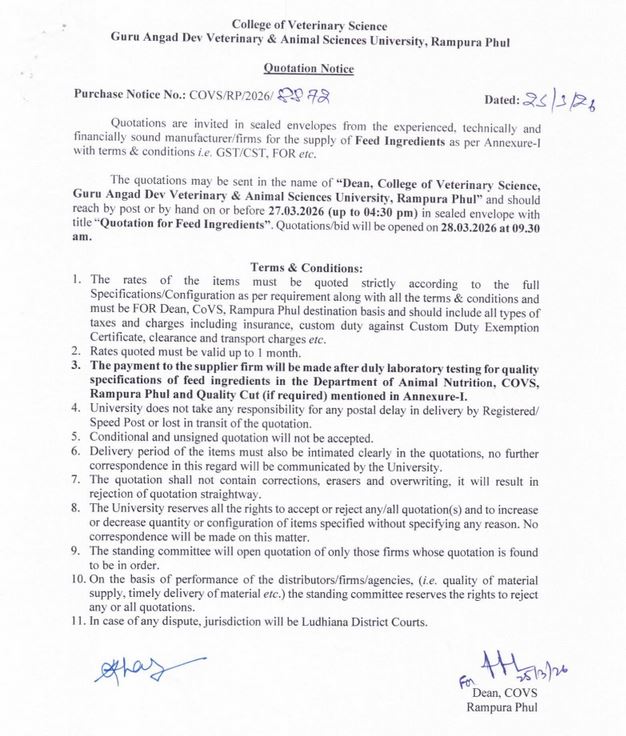 Quotation notice for the supply of Feed Ingredients, Dean, College of Veterinary Science, Guru Angad Dev Veterinary & Animal Sciences University, Rampura Phul