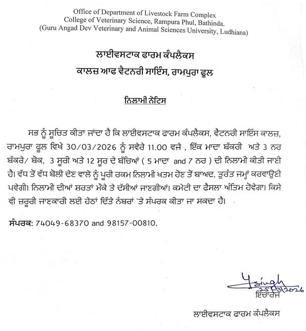 Auction Notice of Goats and Pigs, Director, Livestock Farms, Guru Angad Dev Veterinary and Animal Sciences University, Rampura Phul