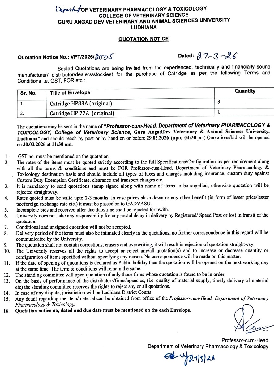 Quotation Notice for the purchase of Catridge, Professor cum Head, Department of Veterinary Pharmacology & Toxicology, COVS, Guru Angad Dev Veterinary & Animal Sciences University, Ludhiana