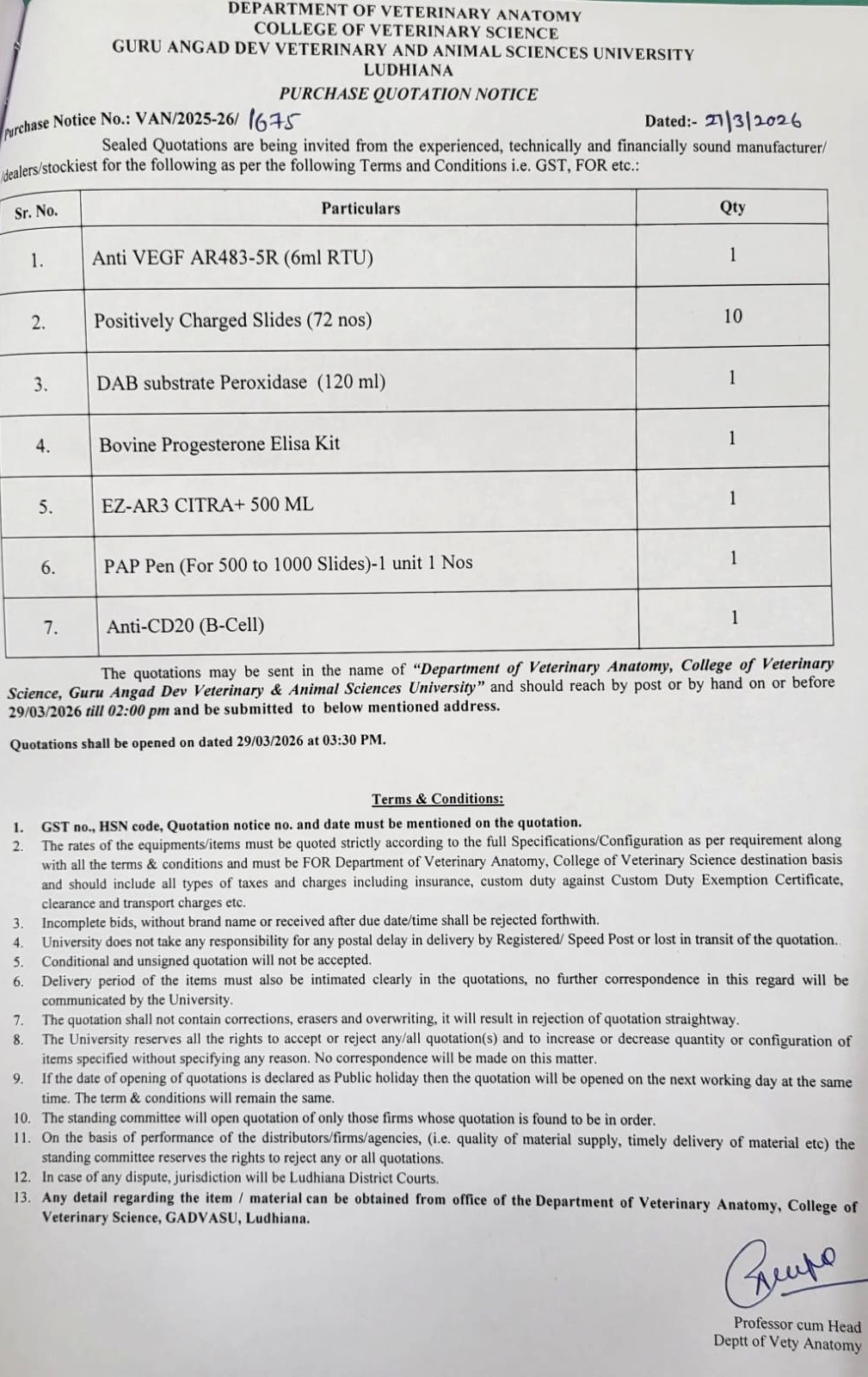 Quotation Notice for the purchase of Chemicals & Lab Material, Department of Veterinary Anatomy, COVS, Guru Angad Dev Veterinary & Animal Sciences University, Ludhiana