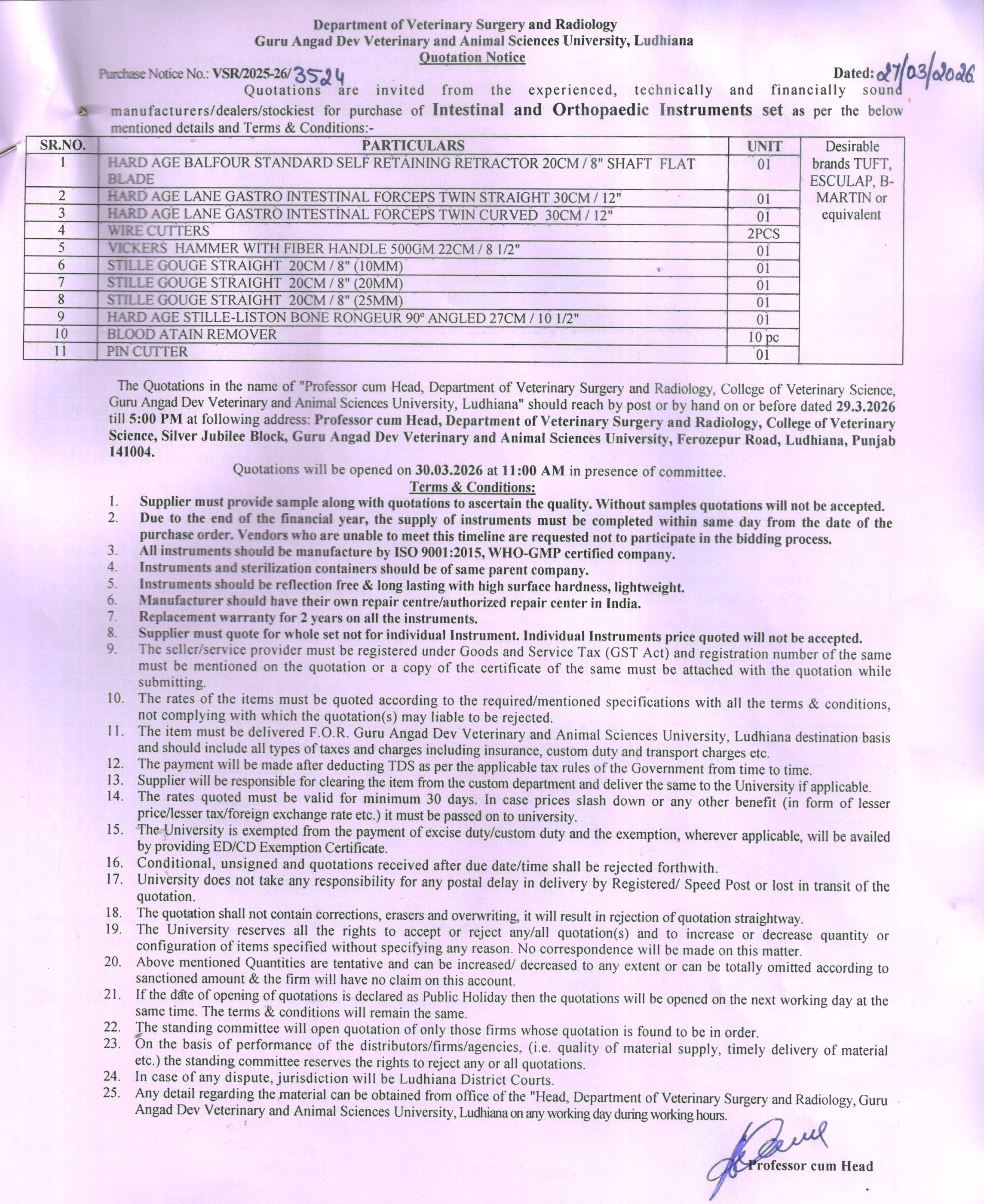 Quotation notice for the purchase of Intestinal and Orthopaedic Instruments Set, Department of Veterinary Surgery & Radiology, Guru Angad Dev Veterinary & Animal Sciences University, Ludhiana