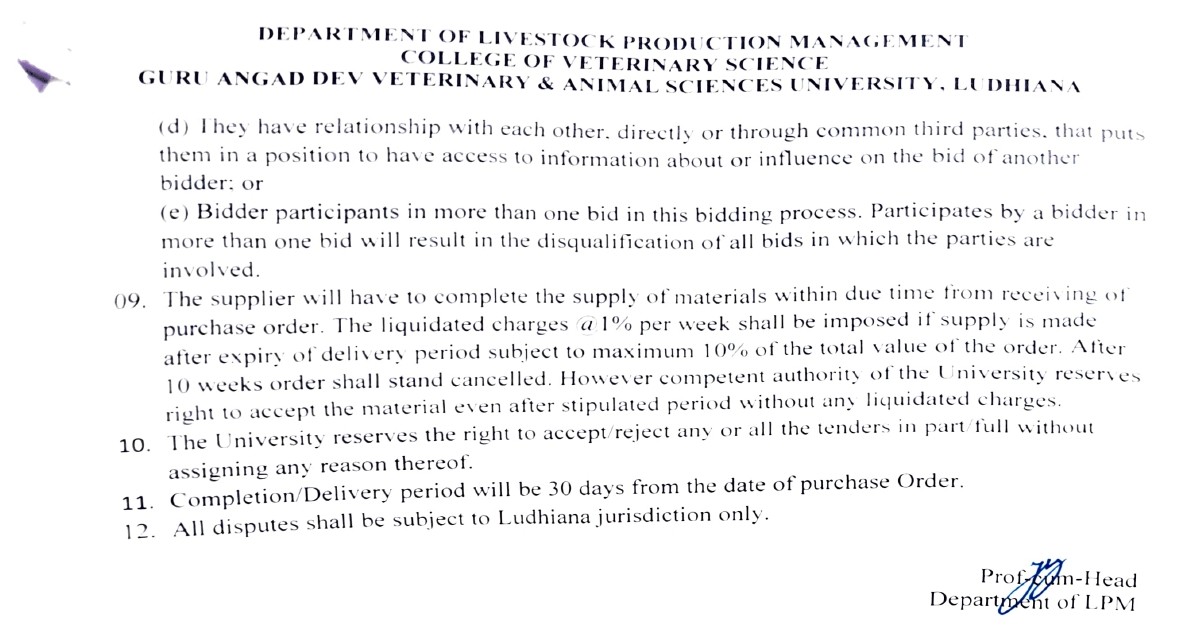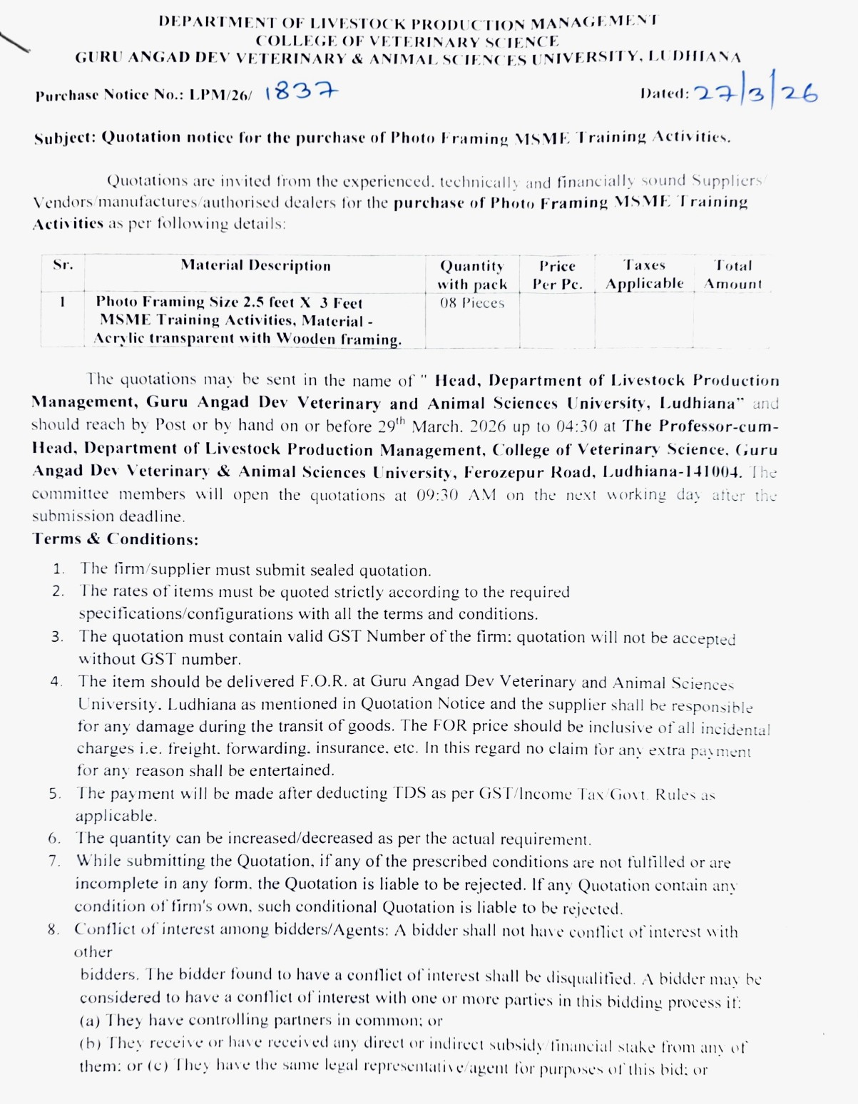 Quotation notice for the purchase of Photo Framing MSME Training Activities, Department of Livestock Production Management, COVS, Guru Angad Dev Veterinary & Animal Sciences University, Ludhiana