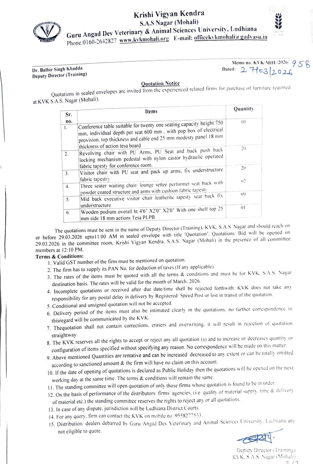 Quotation notice for purchase of Furniture, Deputy Director (Training), Krishi Vigyan Kendra, S.A.S Nagar (Mohali)