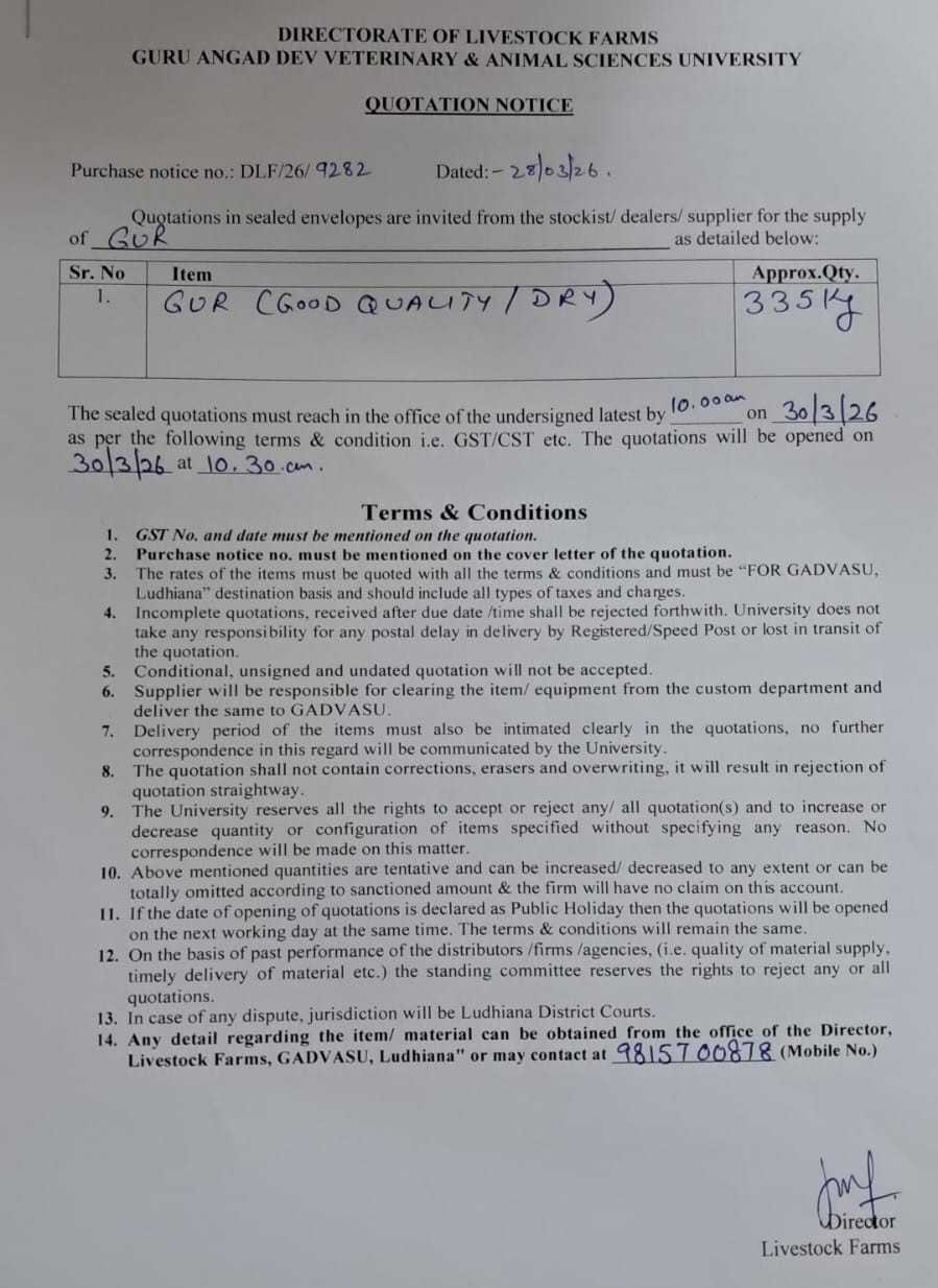 Quotation notice for the supply of Gur, Director, Livestock Farms, Guru Angad Dev Veterinary and Animal Sciences University Ludhiana