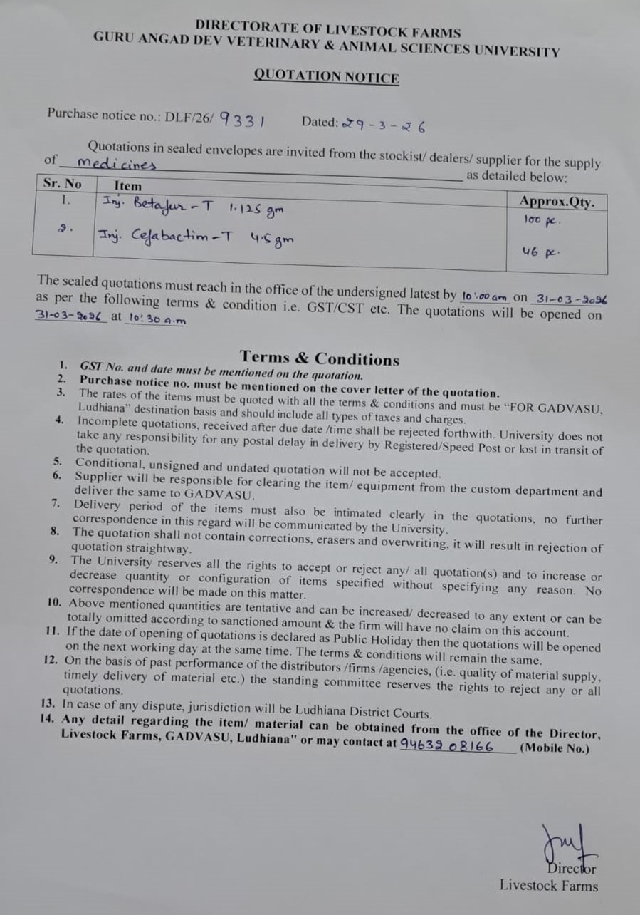 Quotation notice for the supply of Medicines, Director, Livestock Farms, Guru Angad Dev Veterinary and Animal Sciences University Ludhiana